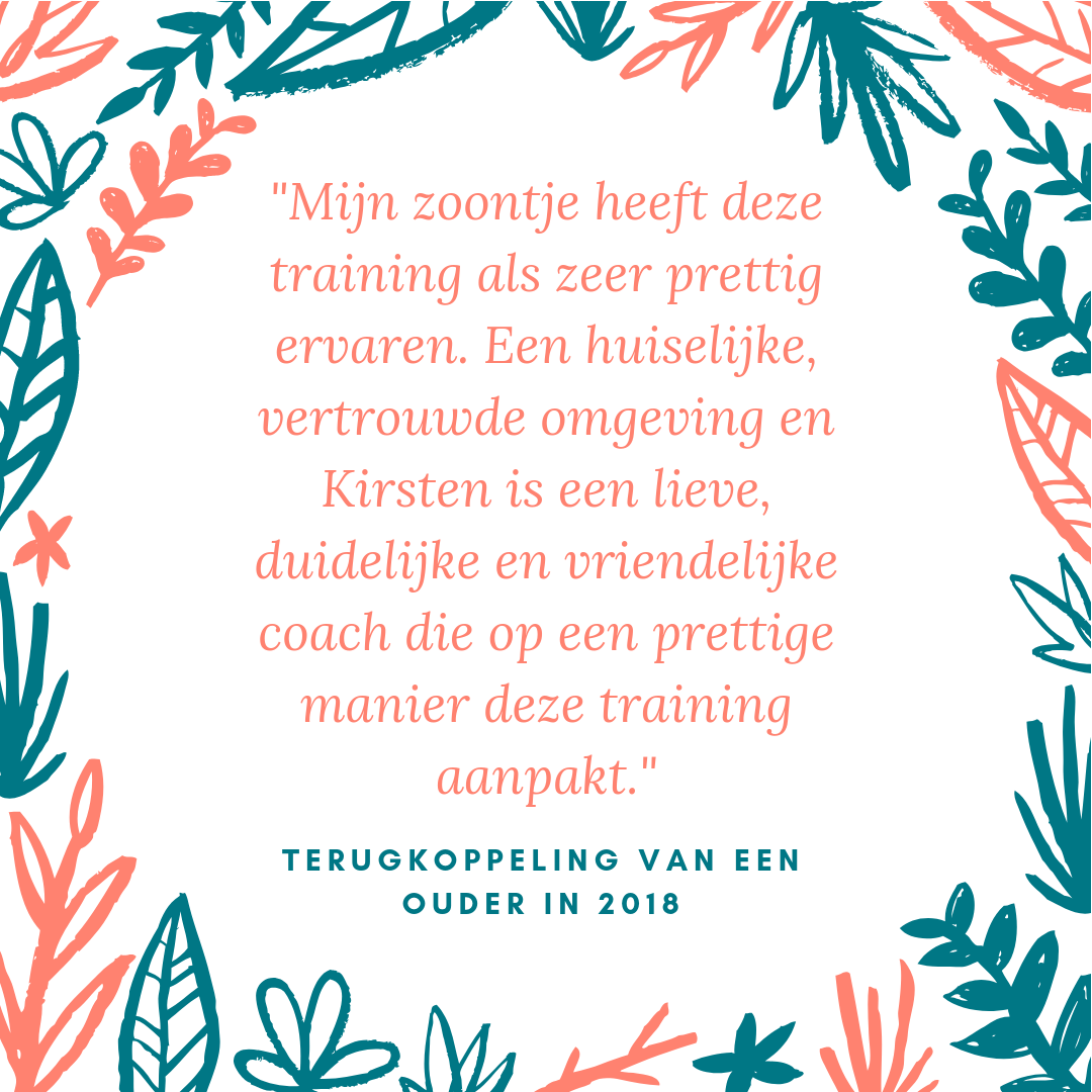 Mijn zoontje heeft deze training als zeer prettig ervaren. Een huiselijke, vertrouwde omgeving en Kirsten is een lieve, duidelijke en vriendelijke coach die op een prettige manier deze training aanpakt